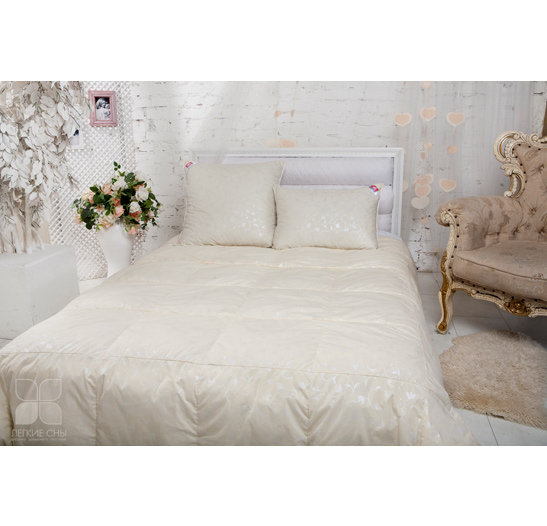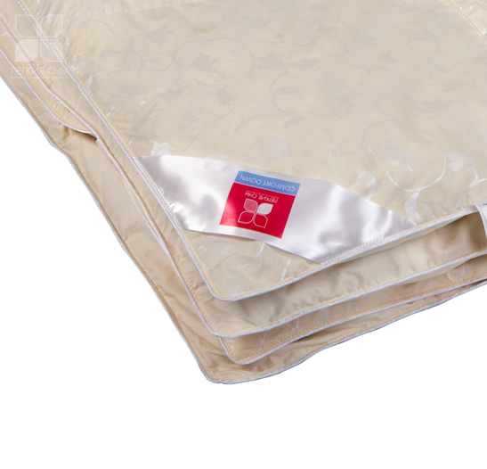 Чехол одеяла выполнен из тика, 100% хлопок. Наполнено оно уникальной смесью - натуральным пухом второй категории (80%) и синтетическим полиэфирным волокном (20%). Чехол двусторонний — с одной стороны однотонный цвета шампань, а с другой декорирован рисунком.