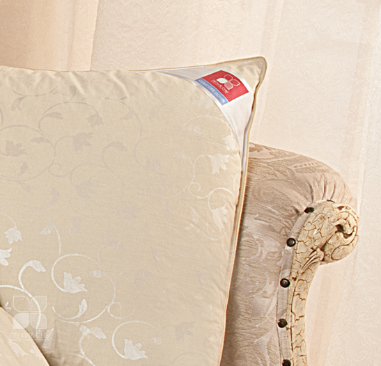Подушка выпускается в двух вариантах цвета: небесно-голубой и теплый — шампань из пуходержащего тика, по периметру отделка шелковым кантом, оттеняющим его своим блеском.