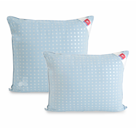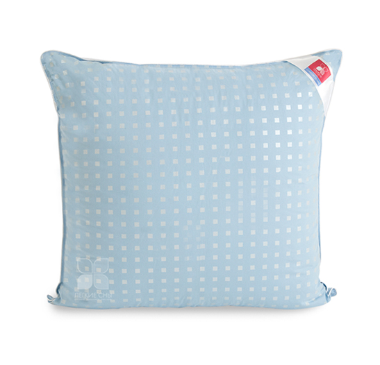 Подушка в традиционном исполнении из небесно-голубого пуходержащего тика с мелким рисунком и белоснежным шелковым кантом по периметру.