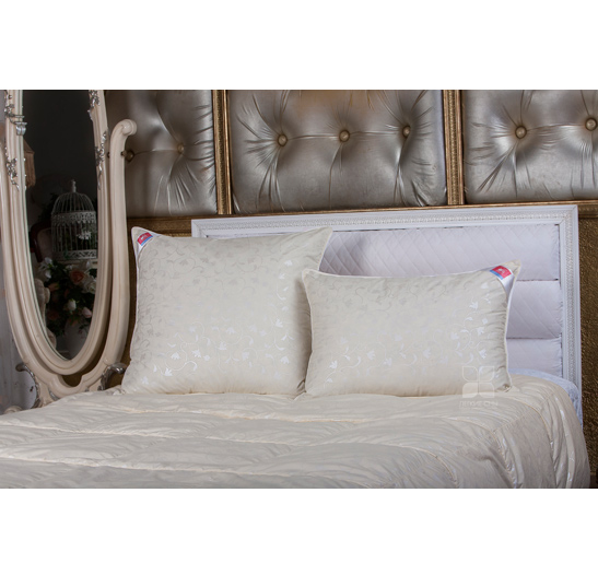 Чехол подушки выполнен из тика, 100% хлопок. Наполнена она уникальной смесью - натуральным пухом второй категории (80%) и синтетическим полиэфирным волокном (20%). Чехол двусторонний - с одной стороны однотонный цвета шампань, а с другой декорирован рисунком.