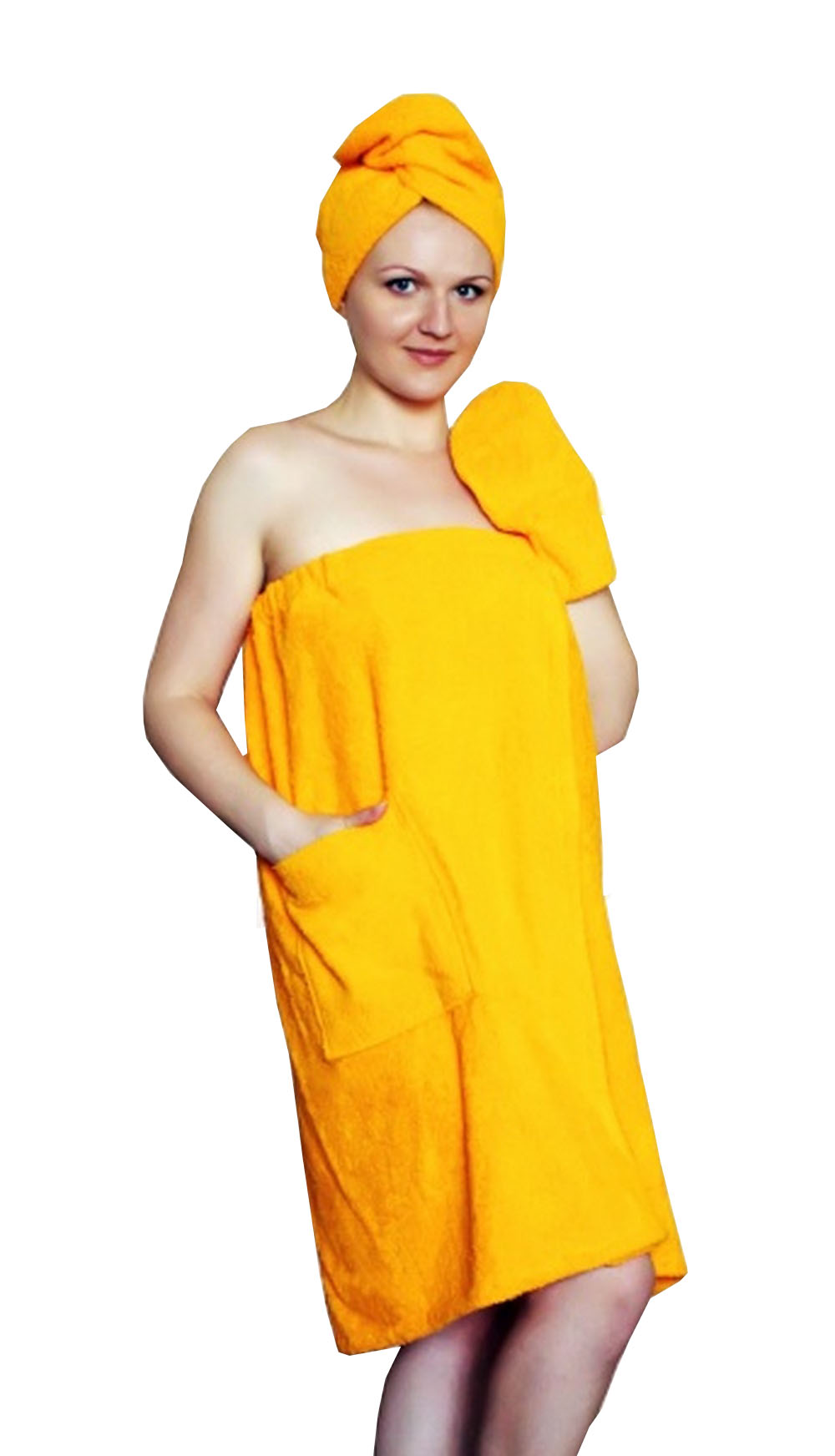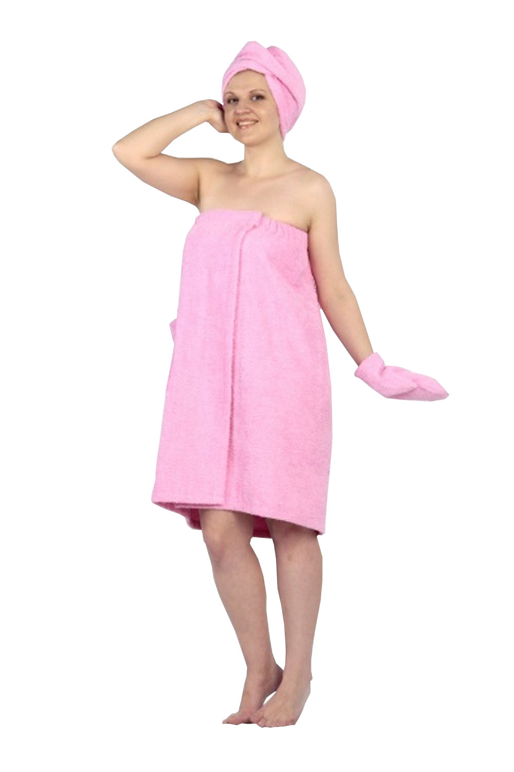 САУНА (БАННЫЙ КОМПЛЕКТ) МОНИКА включает в себя чалму, юбку и рукавицу.  Рукавичка предназначена для безопасного прикосновения к горячим предметам ковшам, тазам. Но чаще всего ей пользуются для массажа тела.  Специально пошитая юбка заменит неудобное полотенце, которое постоянно нужно придерживать рукой, чтобы не сползало. Все предметы, которые входят в банный комплект изготовлены из натуральных природных материалов. Купить Банный комплект для сауны Моника на нашем сайте можно в различных расцветках.